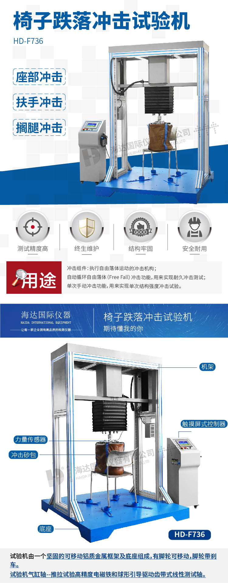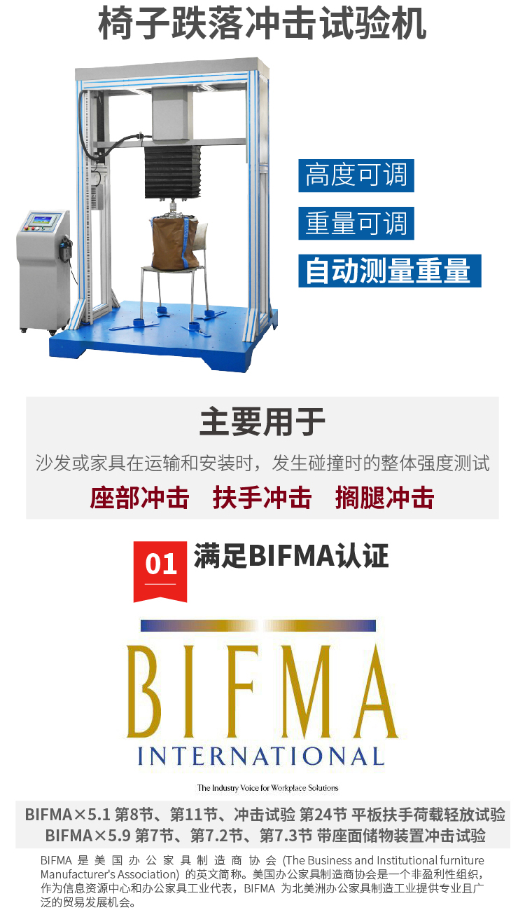 辦公椅沖擊試驗機是一項綜合性能測試項目,評估椅面在垂直力作用下的承受能力。 設(shè)計標(biāo)準(zhǔn):Bifma×5.1 第8節(jié)、第11節(jié)、沖擊試驗 第24節(jié) 平板扶手荷載輕放試驗 Bifma×5.9 第7節(jié)、第7.2節(jié)、第7.3節(jié) 帶座面儲物裝置沖擊試驗 | ||