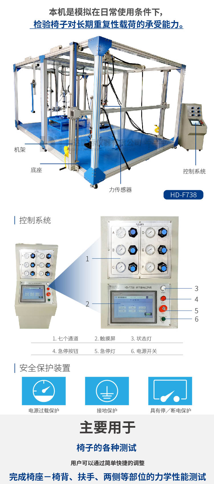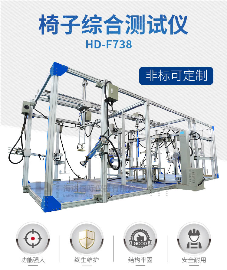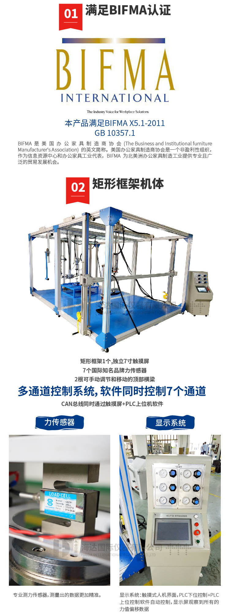 椅子綜合測試儀在同一臺試驗(yàn)機(jī)上可以進(jìn)行椅子的各種測試,用戶可以通過簡單快捷的調(diào)整,完成椅子椅座-椅背、扶手、兩側(cè)等部位的力學(xué)性能測試。 設(shè)計(jì)標(biāo)準(zhǔn):1.Bifma x5.1-2011 2.GB 10357.1 | ||