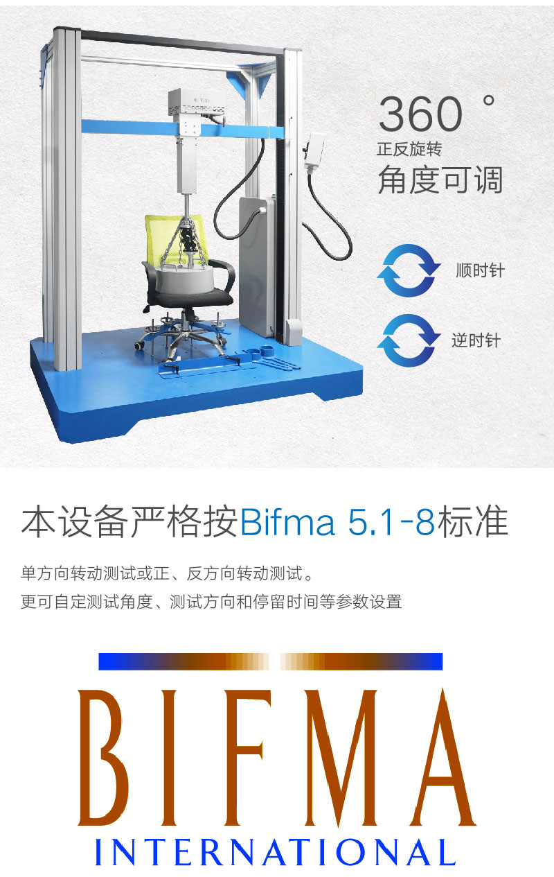 辦公椅旋轉(zhuǎn)壽命試驗機適用于椅面具有旋轉(zhuǎn)功能的辦公椅,用于評估辦公椅子抵受重復旋轉(zhuǎn)的壓力及磨損 1、 可設定正轉(zhuǎn)和反轉(zhuǎn)角度(45°到355°) 2、 單向360°旋轉(zhuǎn)。 | ||