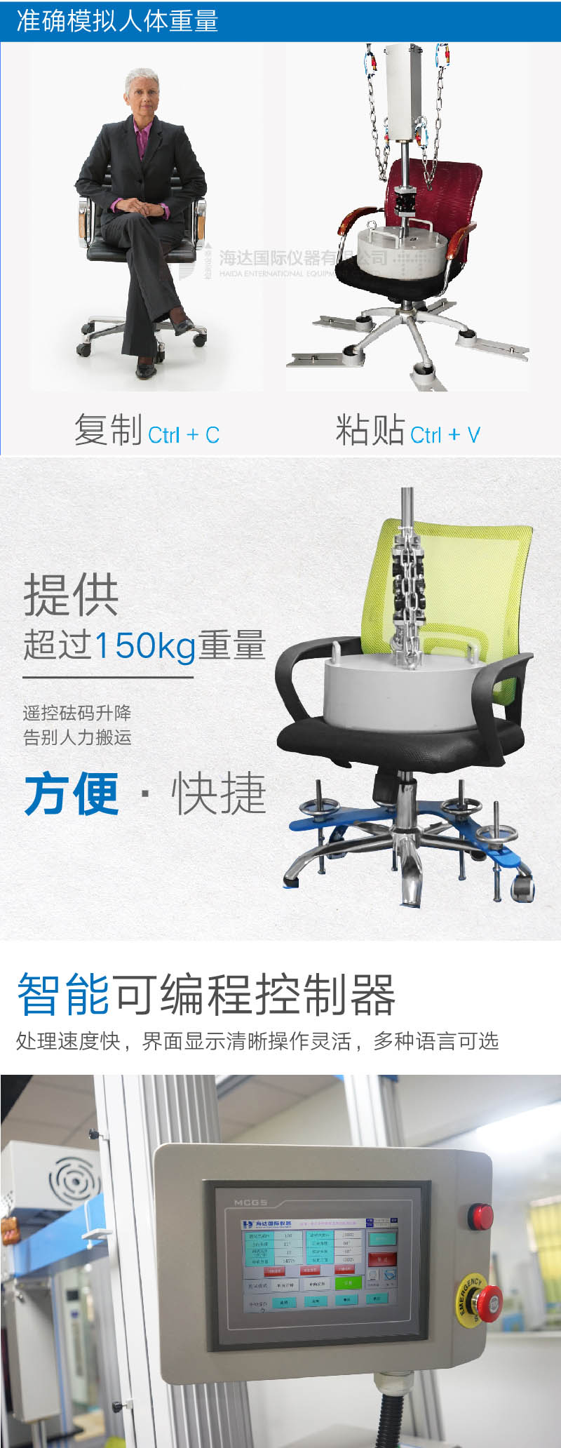 1、本設備除可按Bifma 5.1標準進行。單方向或雙向轉(zhuǎn)動測試或按EN1335標準正、反方向轉(zhuǎn)動測試, 2、更可自定測試角度、測試方向和停留時間等參數(shù)設置 3、本機旋轉(zhuǎn)臺面直徑為800毫米,座椅尺寸寬度0-1000 mm 4、旋轉(zhuǎn)速度5~20周/分鐘,可以自行設定 5、控制模式: 可編程控制器(PLC),配搭大型液晶顯示屏 6、次數(shù)設定:0~999,999次 7、配件:113公斤重砝碼和電動起重裝置,方便提升重物 8、電壓: 單相,AC220V,功率:1KW; 1.加載砝碼 :113KG(一個) 2.測試速度:10±5 r/min 3.顯示方式 :觸摸屏顯示 4.控制方式 :PLC控制 5.測試次數(shù):1-999999次(任意設定) 6.電源:AC /220V、3A、50HZ 7.整機功率:1.5KW 8.機臺尺寸:LxWxH=1850x1200x2450 mm 9.整機帶異常報警功 <主要配件>: 1.椅腳擋塊:1個 2.椅腳壓塊:1套(帶4個鑄鐵手輪)