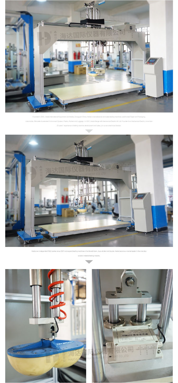 1) 試件:適用床墊尺度:0~2200x2000x400(L x W x H) 2) 控制方式:7寸觸摸屏+匯川PLC 3) 電氣連接:?jiǎn)蜗?nbsp;AC220V/50HZ功率:750W/400W 4) 標(biāo)準(zhǔn)配件:壓陷量測(cè)試頭一個(gè)、量具一把 5) 尺寸:整體3650x1000x2700(L x W x H) 控制器 350x350x1100 (L x W x H) 6) 重量:500KG | ||