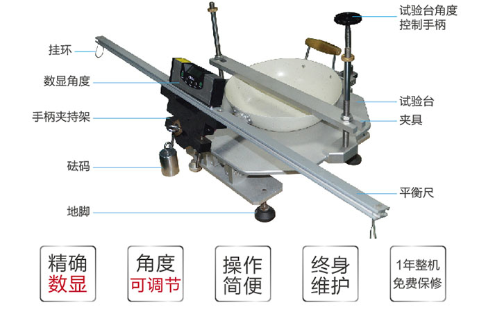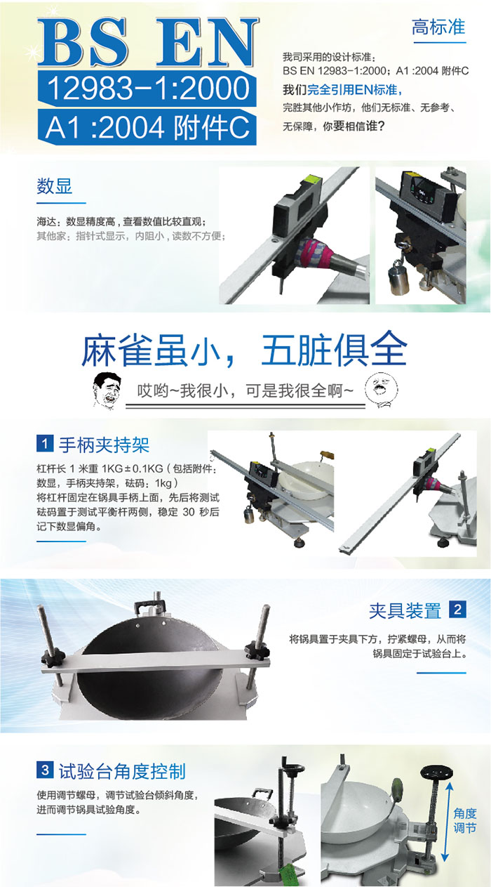 指標參數(shù)數(shù)顯角度尺BevelBox DP-180WM(2按鍵)平衡桿長1米重1KG±0.1KG(包括附件及指針,手柄夾持架)砝碼1kg最大樣品尺寸450×450×180mm(L*W*H)刻度分辨率0.1°外形尺寸1100×532×389mm(L*W*H) 把試樣固定在測試平臺上,調(diào)節(jié)緊固裝置的角度,使連接炊具手柄的平衡桿達到水平,同時指針指向分度表的零位。把測試砝碼分別懸掛于平衡桿的一端并保持靜止30s,角度尺記錄平衡桿偏轉(zhuǎn)的角度,檢查手柄和連接部件,記錄試樣的損壞情況。 操作步驟 1、將樣品預先做耐熱試驗;平橫桿長1m 、重1Kg±0.1Kg,其中包括附件及指針,手柄夾持架,安裝時夾持架圓心與手柄圓心重合,桿與手柄無相對移動; 2、將手柄組件在手柄長度方向的中點處與測試平衡桿緊固; 3、將測試樣品裝與測試機架上,并調(diào)整測試平衡桿使其水平; 4、將測試砝碼置于測試平衡桿左側(cè),穩(wěn)定30S后計下指針偏角; 5、將測試砝碼置于測試平衡桿右側(cè),穩(wěn)定30S后計下指針偏角; 6、檢查手柄及連接件,并記錄損害程度 | ||
