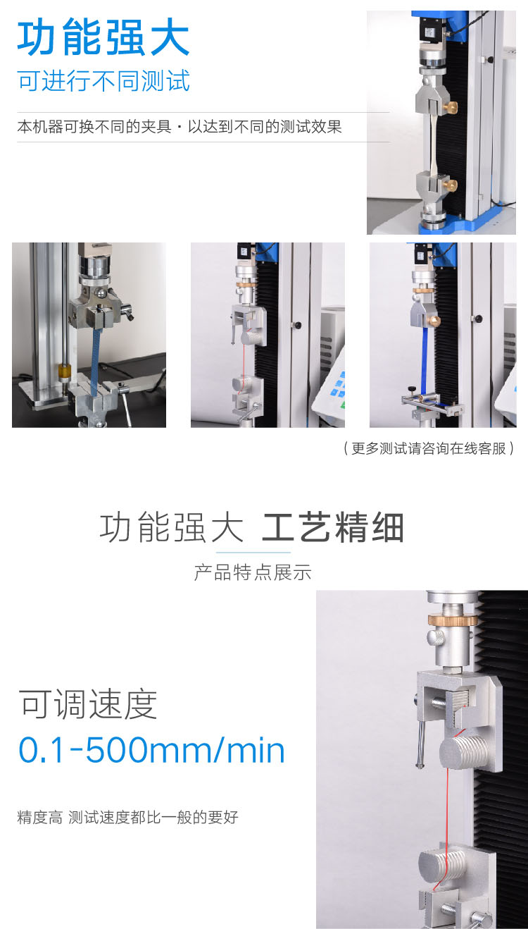 1、容量:5-200kg進(jìn)口傳感器 50-200kg 2、電機(jī):400w松下伺服電機(jī) r 3、驅(qū)動器:400w松下伺服驅(qū)動器 4、絲桿:進(jìn)口滾珠絲桿 5、控制方式:面板控制(LCD顯示),可連電腦,windows模式操作 6、速度: 0.1-500mm/min速度可調(diào) 7、滿載行程:900mm(含夾具) 8、荷重分解度:1/250,000 9、荷重精度:≤0.5% 10、單位切換Units:gf/kgf/N//kN/LBf/T 11、外形尺寸:(L*W*H)520*515*1250mm 12、重量:約70KG 13、電源:1∮, AC 220V, 50Hz 海達(dá)萬能拉力試驗機(jī)型號用途對比以下萬能材料試驗機(jī)可進(jìn)行:抗拉強(qiáng)度、抗壓強(qiáng)度及伸長量,可做剝離、撕裂、抗彎、抗折、壓縮等試驗。適用:膠帶、標(biāo)簽、膠黏劑、保護(hù)膜、鍍層、金屬、電子、電線電纜、防水卷材、PCB材料、鋁合金、編織袋、塑料、橡膠、無紡布、安全帶等很多行業(yè)材料。型號款式特點(diǎn)容量1kg=9.8N測試功能適用材料HD-B602單柱電子式,經(jīng)濟(jì)型200kg拉伸、壓縮、彎曲、撕裂、延伸率、剝離、剪切、粘接力、高粘剝離測試端子拉力、塑料件拉伸、密封圈……HD-B609單柱電腦式 雙顯200kg薄膜、塑料、離型紙/膜、膠帶、紙張、復(fù)合帶、打包帶、鋁箔、保護(hù)膜、鋁塑板……HD-B609B-S單柱電腦伺服式200kg薄膜、離型紙/膜、膠帶、紙張、復(fù)合帶、打包帶、鋁箔、保護(hù)膜、鋁塑板、鏡片(抗壓)、吸波材料(抗壓)……HD-B617 單柱電腦式雙顯500kg線束、端子、橡膠、塑料……HD-B617-S單柱電腦伺服式500kg線束、端子、橡膠、塑料……HD-B603雙柱 門式電腦式2T拉斷、拉伸、抗壓、三點(diǎn)抗彎、四點(diǎn)抗彎曲測試 、撕裂、剪切等 電線電纜、木材、某些金屬、塑料、打包帶、背包、塑料桶(抗壓)、焊接點(diǎn)、安全帶(拉伸)、防水卷材(拉伸)……HD-B604-S雙柱門式電腦伺服式2T電線電纜、橡膠、鏈輪、PVC手套、木材、打包帶、某些金屬、焊接點(diǎn)、木地板鎖扣 ……HD-B604B-S雙柱門式電腦伺服式2T電線電纜、橡膠、鏈輪、PVC手套、木材、打包帶、某些金屬、焊接點(diǎn)、木地板鎖扣、安全帶(拉伸)、防水卷材(拉伸)……HD-B615-S雙柱門式電腦伺服式5T金屬、鋼絲、鋼絲繩……HD-B612-S雙柱門式電腦伺服式10T~30T拉伸、壓縮、彎曲、粘合、剪切、環(huán)剛度、彈簧拉壓金屬板材、鋼絲、鋼管、鋼板、鋼筋……HD-B616雙柱門式油缸下置式30T/60T/ 100T抗拉、抗壓、屈服強(qiáng)度等金屬板材、鋼絲、鋼管、鋼板、鋼筋……HD-B607-S雙柱門式高低溫環(huán)境 電腦伺服式3T高低溫、抗拉、抗壓等塑料、橡膠……夾具提示:200多款不同夾具,具體需依據(jù)客戶具體測試樣品選型。備注:以上參數(shù)僅供參考,為對客戶負(fù)責(zé),具體材料選型請以銷售溝通后為準(zhǔn)。 | ||