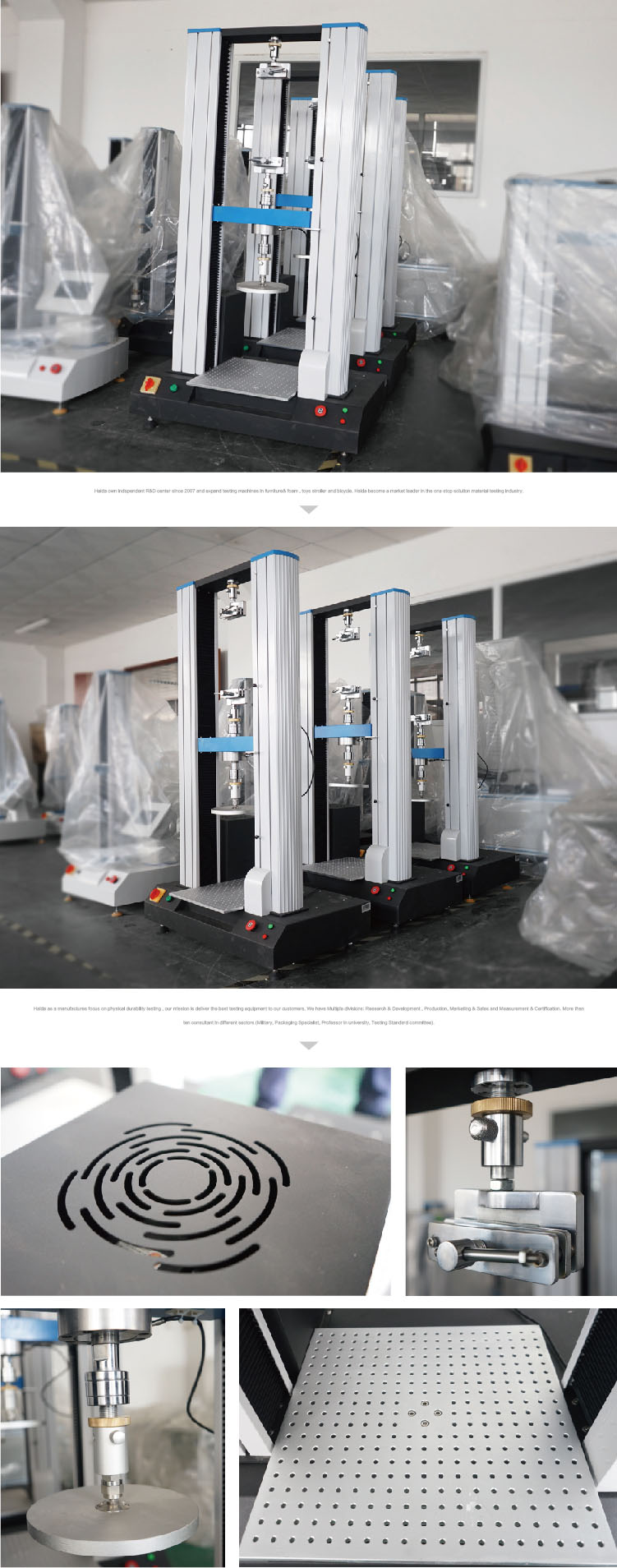 本產(chǎn)品廣泛應(yīng)用于測試各類五金、金屬、橡塑料、鞋業(yè)、皮革、服裝、紡織、絕緣體、電線電纜、端子等材料的拉伸、撕裂、剝離、抗壓、彎曲抗剪力、三點抗折、延伸率,以及對海綿、泡沫等多孔彈性材料的壓縮凹入硬度、壓陷比等各項物性性能的測試。也用于測定海綿、泡沫等多孔彈性材料的壓縮凹入硬度和計算壓陷比 設(shè)計標(biāo)準(zhǔn):GB/10807-2006, ITTC 1.1 硬度測試,ITCC 1.2 壓陷比 ISO2439, ASTM D3574 HG/T 5836-2021 乳膠墊 本標(biāo)準(zhǔn)規(guī)定了乳膠墊的要求、試驗方法、檢驗規(guī)則和包裝、標(biāo)志、運輸與貯存。本標(biāo)準(zhǔn)適用于由天然膠乳、合成膠乳或由天然膠乳與合成膠乳并用的混合膠乳加入配合劑經(jīng)發(fā)泡、硫化等工藝制備的乳膠墊芯與墊套組成的乳膠墊 操作原理 壓陷硬度測試:將試樣置于上、下壓盤間,上壓盤以規(guī)定速度向下壓縮一定的尺寸,按標(biāo)準(zhǔn)要求的A法(B法、C法)進行測試,荷重元將感應(yīng)到的壓力反饋給電腦處理,通過電腦測試界面查看數(shù)據(jù)結(jié)果,從而測得海綿、泡沫等試樣等材料的壓陷硬度。 拉伸測試:沿試樣縱向主軸方向恒速拉伸,直到試樣斷裂或其應(yīng)力(負(fù)荷)或應(yīng)變(伸長)達(dá)到某一預(yù)定值,測量在這一過程中試驗承受的負(fù)荷及其伸長量。 | ||