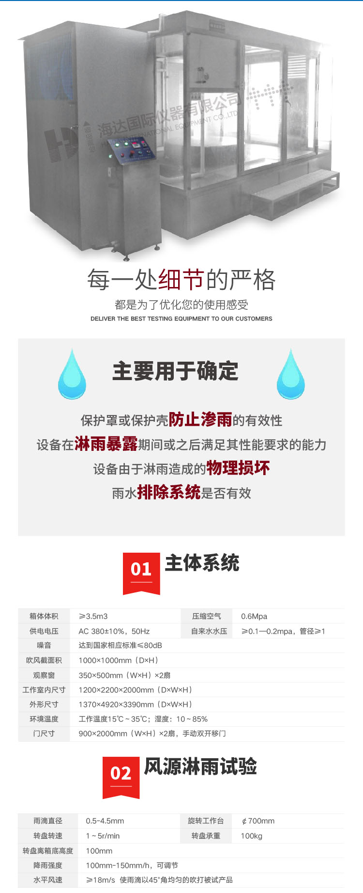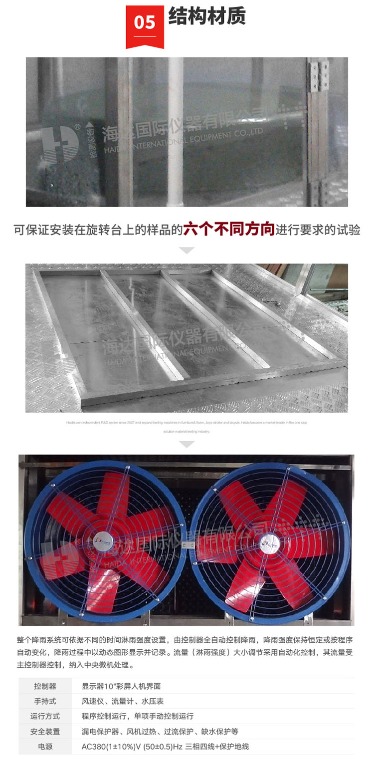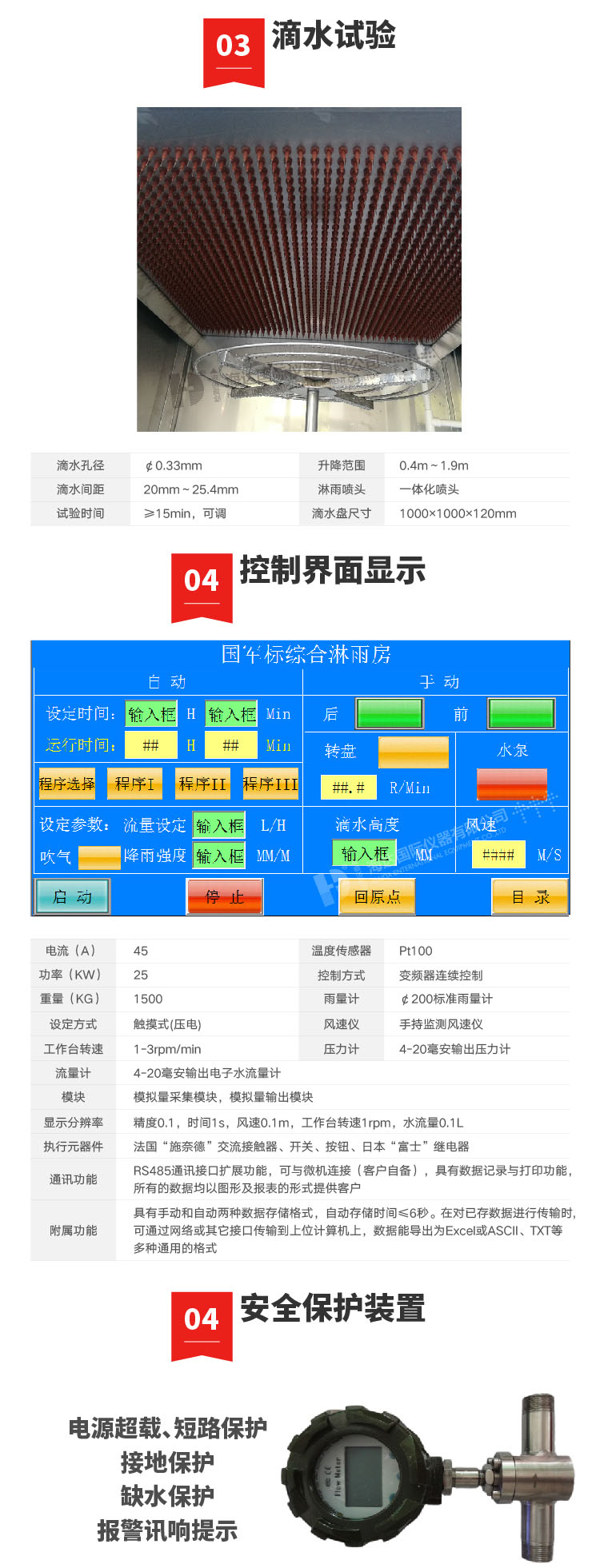 1、內(nèi)箱尺寸(mm):2500×1500×2800(深×寬×高) 外型尺寸(mm)3800X 1600X3500(深×寬×高) 2、試驗(yàn)臺(tái)轉(zhuǎn)速(rpm):1 ~3可調(diào) 3、滴水箱(mm): (1)1000X1000MM 孔距20X20Mm,孔徑:0.6Mm 4.、滴水箱與被測(cè)樣品的距離:1000MM 5、滴水孔直徑(mm):φ0 .4 (水滴直徑0.5-4.5MM) 6、噴水孔徑間距(mm):20 MM 7、試驗(yàn)時(shí)間:1-999,999min(可設(shè)定) 10、樣品溫度:高于常溫水10° 11、箱體采用方通做骨架,彩鋼板作為封板。 12、配有適中的樣品架(放樣品用)轉(zhuǎn)速可調(diào),正方型:1000X1000MM 13、滴水試驗(yàn)機(jī)降水量:1.7mm/min 14、控制系統(tǒng):公司自主研發(fā)的Teelong控制系統(tǒng)。 滴水試驗(yàn)房滴水要求 ① 雨滴直徑范圍:0.5~4.5mm ; ② 雨滴均勻降落,使試驗(yàn)臺(tái)面上樣品所有向上的表面在試驗(yàn)期間能同時(shí)經(jīng)受到雨滴; ③ 具備從高1m處勻速降落的雨水且試驗(yàn)持續(xù)時(shí)間大于15min的試驗(yàn)?zāi)芰Γ?/span> ④ 噴嘴為方格噴霧點(diǎn)陣或其它交錯(cuò)的點(diǎn)陣; ⑤ 滴水箱采用真空設(shè)計(jì),配以氧化合金鋁及高防銹不銹鋼材質(zhì)構(gòu)造,噴咀接觸位不銹鋼錐形設(shè)計(jì),方便及時(shí)安裝及更換針咀; ⑥ 直流電動(dòng)升降馬達(dá)驅(qū)動(dòng),不銹鋼絲桿、滑輪導(dǎo)軌輔以鎖緊螺母升降裝置; ⑦ 鋁合金和不銹鋼機(jī)身; ⑧ 水箱邊框:工業(yè)合金鋁(表面氧化); ⑨ 水箱板:水箱采用USU304#不銹 (其中下封板有安裝針座的螺紋孔); ⑩ 水箱升降導(dǎo)軌:成型導(dǎo)軌、膠質(zhì)滑輪導(dǎo)輪; ? 滴水孔徑:¢0.6mm和0.33Mm; ? 孔 距:20mm; ? 降雨量:1.7mm/min,用戶自設(shè)定參數(shù)( 誤差:+0.2mm/min); ? 試驗(yàn)時(shí)間:0-999min (可設(shè)定及中間控制)。 結(jié)構(gòu)材質(zhì) 1. 可保證安裝在旋轉(zhuǎn)臺(tái)上的樣品的四個(gè)不同方向進(jìn)行 要求的試驗(yàn); 2. 承載≥100Kg、安裝樣品的面積≥φ1200; 3. 轉(zhuǎn)速范圍:1~5rpm/min連續(xù)可調(diào),可設(shè)定自動(dòng)工作; 4. 試件尺寸空間:600mm×600mm×1800mm; 5. 淋雨板尺寸:W1000×D1000×H120mm; 6. 滴雨試驗(yàn)室內(nèi)部尺寸:W2500×D1500×H2800mm; 7. 外部尺寸:W3800×D1600×H2700mm; 8. 材料:靜電噴塑薄板外殼 9. 內(nèi)體:304#; 10. 滴水盤:304#; 11. 旋轉(zhuǎn)臺(tái)面:304#; 12. 支架型材:304#; 13. 工作室門:平拉門,帶鋼化玻璃觀察窗; 14. 風(fēng)機(jī)葉輪:鋁合金噴塑材料; 15. 風(fēng)機(jī):軸流風(fēng)機(jī); 16. 控制器:顯示器 7"彩屏人機(jī)界面; 17. 運(yùn)行方式:程序控制運(yùn)行;單項(xiàng)手動(dòng)控制運(yùn)行; 18. 設(shè)定方式:觸摸式(壓電); 19. 設(shè)定精度:時(shí)間:1秒,風(fēng)速1米/秒; 20. 工作臺(tái)轉(zhuǎn)速:1rpm/min; 21. 控制方式:PLC、步進(jìn)電機(jī)等控制; 22. 電源:AC380(1±10%)V (50±0.5)Hz 三相四線+保護(hù)地線; 23. 電源電流(A) 45 、功率(KW) 25 、重量(kg) 1500; 24. 保護(hù)裝置:漏電保護(hù)器、風(fēng)機(jī)過熱、過流保護(hù)、缺水保護(hù)等。 保護(hù)裝置 1、電源超載、短路保護(hù) 2、接地保護(hù) 3、缺水保護(hù) 4、報(bào)警訊響提示 | ||