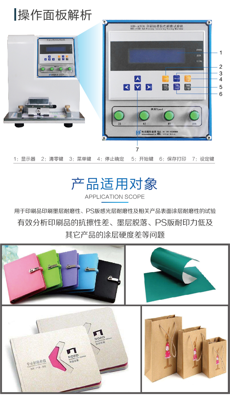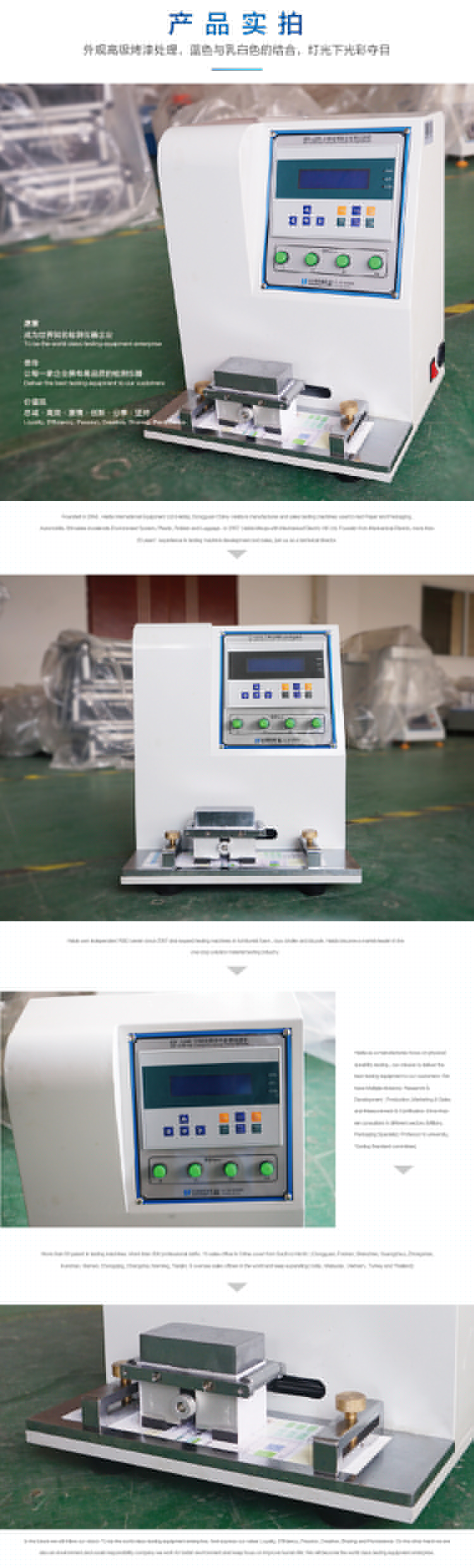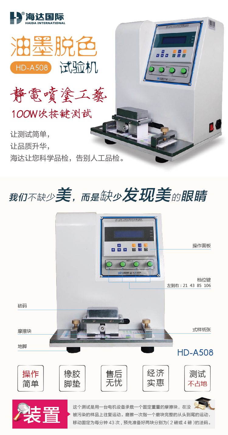 油墨脫色試驗機(jī)(液晶屏)HD-A5088用來測試油墨粘著力,以此來判斷油墨的好壞.本機(jī)可做干磨測試,濕磨測試,脫色變化測試,紙張模糊測試及特殊磨擦測試。墨跡耐磨測試是為評估紙張或紙板上墨跡的耐磨損或耐磨擦力而設(shè)計的測試方法。用于印刷品印刷墨層耐磨性、PS版感光層耐磨性及相關(guān)產(chǎn)品表面涂層耐磨性的測試試驗。有效分析印刷品的抗擦性差、墨層脫落、PS版的 耐印力低及其它產(chǎn)品的涂層硬度差等問題。 油墨脫色試驗機(jī)(液晶屏)HD-A508特點(diǎn): 1、微電腦控制、LCD動態(tài)顯示、薄膜微動操作面板; 2、試驗參數(shù)按鍵輸入,并具備斷電記憶功能; 3、準(zhǔn)確執(zhí)行國家標(biāo)準(zhǔn),與國際標(biāo)準(zhǔn)兼容; 4、控制解決印刷品墨層耐磨性差、抗擦性低、易脫落等問題; 設(shè)計標(biāo)準(zhǔn):JIS-5071-1,TAPPI-UM486,GB7706 |