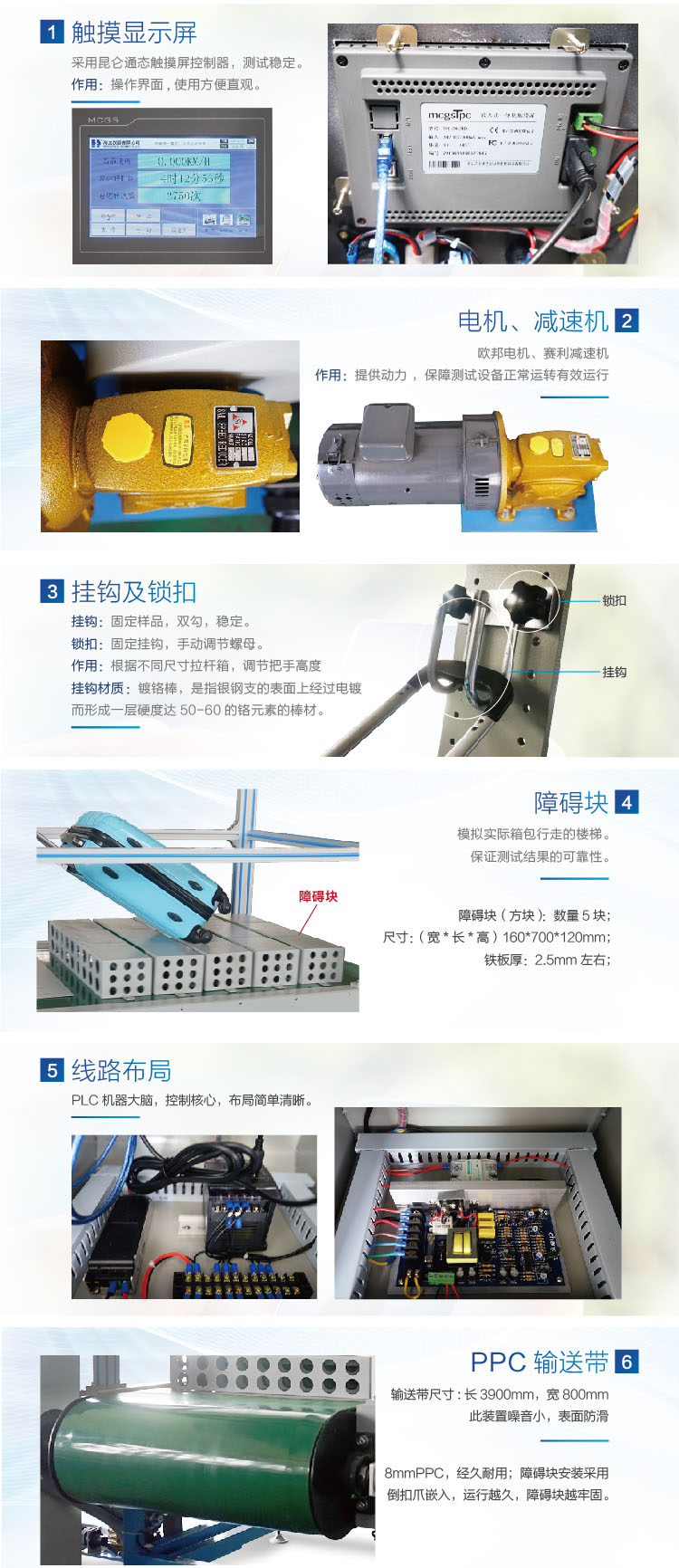 1.控制方式:彩色觸摸屏(方便實用),人機界面操作方式 2.測試速度:0-3km/h (可調(diào)) 3.試驗次數(shù):0-9999次 4.階梯高度:高15cm 三塊 5.階梯路面寬12*0.3cm 兩塊 6.拉桿測試高度調(diào)節(jié):手輪快速調(diào)節(jié) 7.輔助功能:中途試件掉落,感應(yīng)到會自動停機 8.電源:AC220V 50HZ | ||