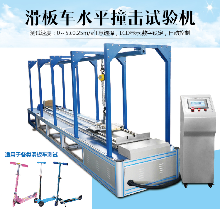 本機是對輪滑鞋或制動器被外物沖擊后,鞋輪或制動器是否受損。測試時以一定的荷重一定的速度撞擊鋼板,檢查輪滑鞋受損情況。采用PLC控制,次數(shù)可任意設定,速度可任意選擇。 依據(jù)EN13899:2003,EN13843:2003,GB20096-2006設計。
