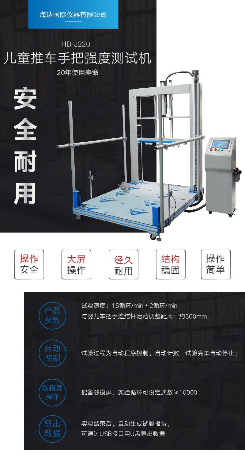 本機依據(jù)GB14748手推嬰兒車舉起下壓耐用試驗規(guī)范。測試方法為置模型嬰兒(或砝碼)于車臺中,舉起時使車臺后輪離地120mm,下壓時使車臺前輪離地120mm,以每分鐘15±1次,并持續(xù)往復測試3000次后,目視車臺有無損壞。達設定次數(shù),并能自動停止操作,故可24小時操作而無須人員看守。 |