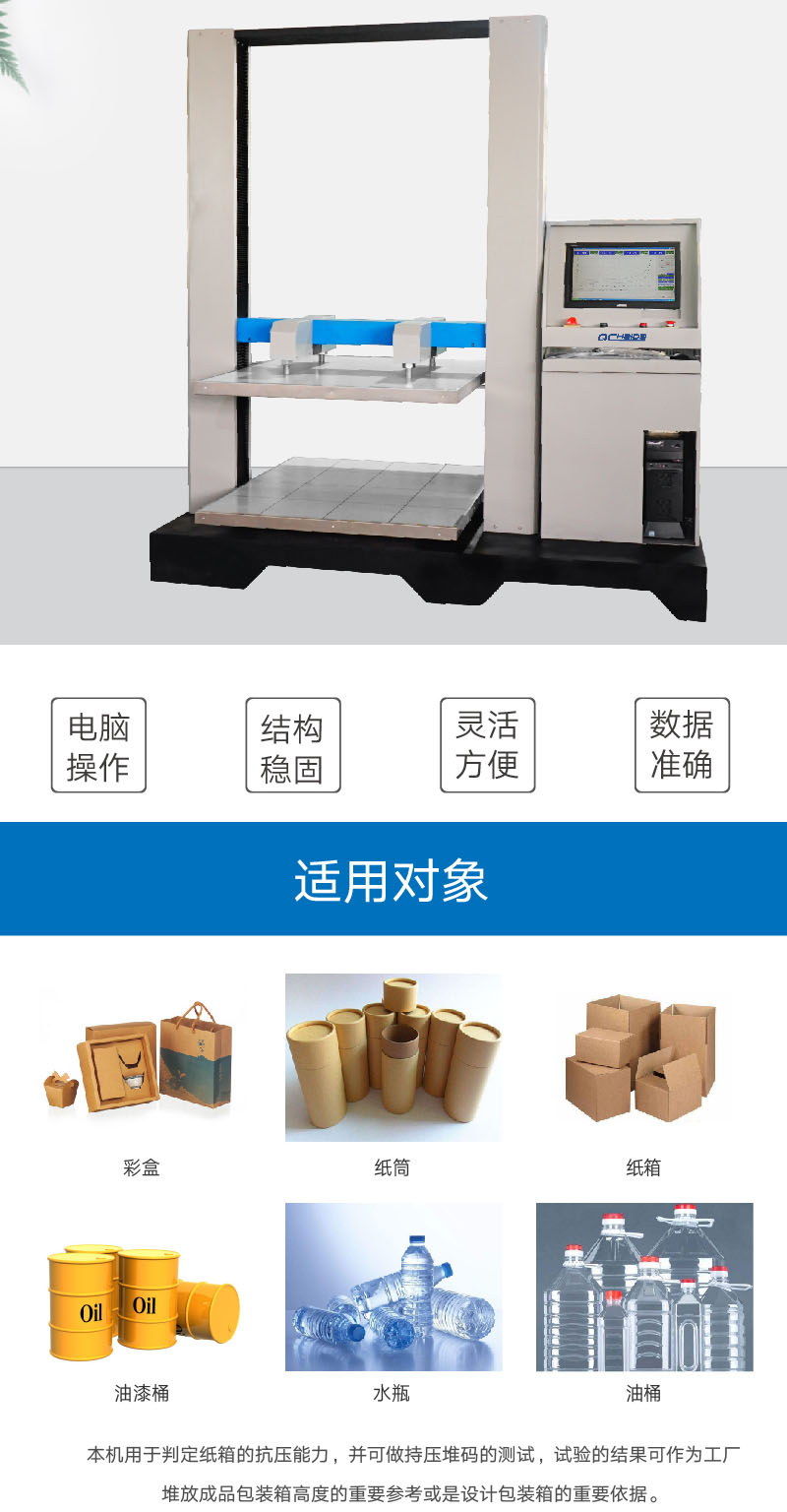 計算機(jī)伺服紙箱抗壓試驗機(jī)HD-A505S-1200是檢驗紙箱或其它包裝容器耐壓強(qiáng)度最直接的測試儀器,用于判定紙箱的抗壓能力,并可做持壓堆碼的測試,試驗的結(jié)果可作為工廠堆放成品包裝箱高度的重要參考或是設(shè)計包裝箱的重要依據(jù)。適用于瓦楞紙箱、蜂窩板箱等包裝件的耐壓、形變、堆碼試驗。并兼顧塑料桶(食用油、礦泉水)、紙桶、紙盒、紙罐、集裝容器桶(IBC桶)等容器的抗壓試驗。 設(shè)計標(biāo)準(zhǔn):TAPPI-T804,JIS-20212,GB4857.3.4, ASTM-D642, QB/T1048, BS EN ISO 12048, GB/T4857.16, GB/T8167, GB/T8168, GB/T4857.3,GB/T4857.4 | ||