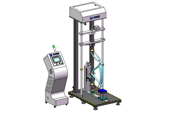 性能測試:將車架/前叉組件裝在后軸上,這樣可以使其能繞后軸在垂直平面內(nèi)自由轉(zhuǎn)動;在前叉上面安裝上一只按照標(biāo)準(zhǔn)(GB3565標(biāo)準(zhǔn)里27.1項)制作的滾輪;調(diào)節(jié)車架中軸桿位置,使前叉滾輪與后軸垂直在同一直線上。使重錘輕觸滾輪,位移歸零。觸摸屏上輸入所需沖擊高度,點擊測試按鈕即可進(jìn)行自動測試